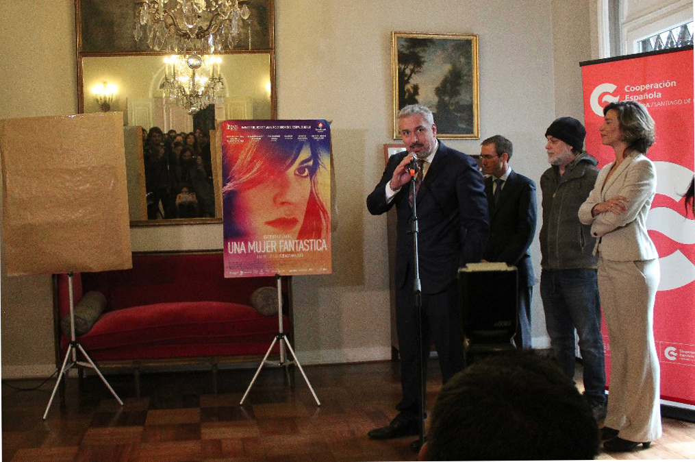 El Ministro de Cultura Ernesto Ottone, el Encargado de Negocios de la Embajada Gonzalo Vega, y la Consejera Cultural Rebeca Guinea, fueron los encargados de presentar la película “Una mujer fantástica” como la elegida por el Consejo del Arte y la Industria Audiovisual de Chile para competir en los premios Goya y Oscar en las categorías de “Mejor Película Iberoamericana” y “Mejor película extranjera”, respectivamente.